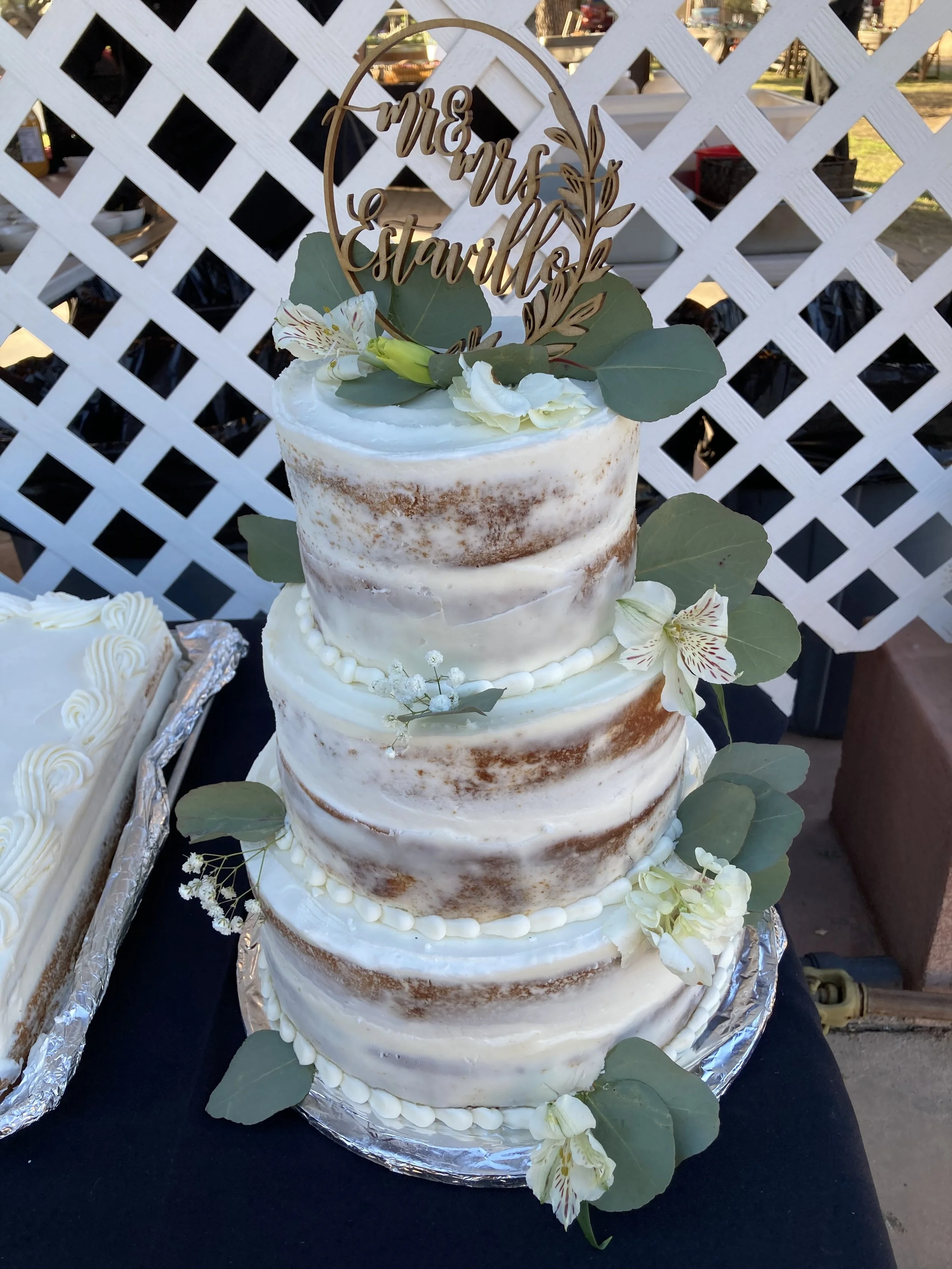 The “Naked” wedding cake style consists of a lightly frosted and detailed base, with the option to customize cake flavor, frostings, fillings, and toppings. Submit an order form through our website for a quote!